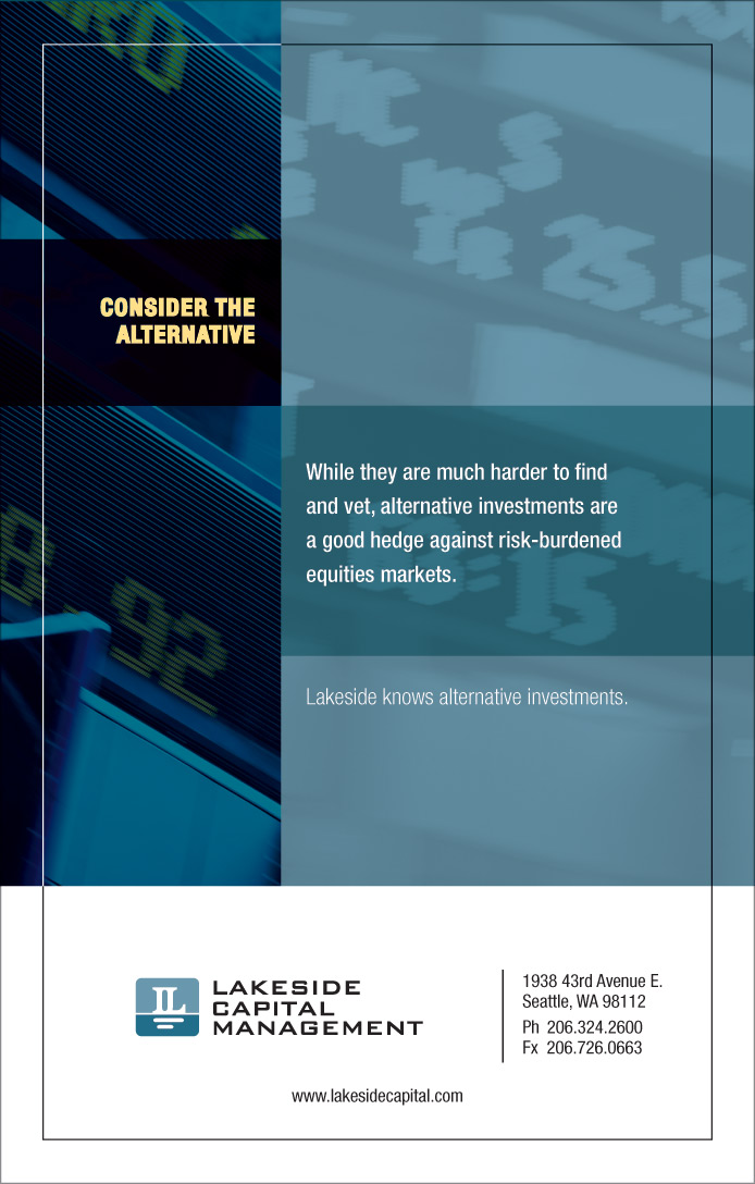 This young capital management firm needed a brand identity that reflected the conservative management philosophy of the principals. Since their offices were situated on Lake Washington, a placid water scene seemed a perfect metaphor. Along with the mark, branding included stationery, a custom presentation folder for client documents and a print ad campaign that emphasized the firm's unique investment philosophy.